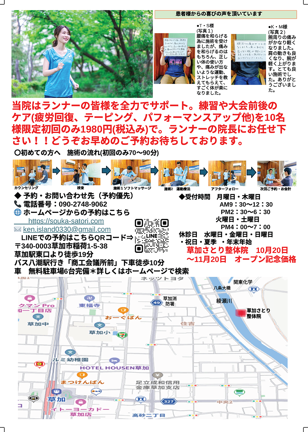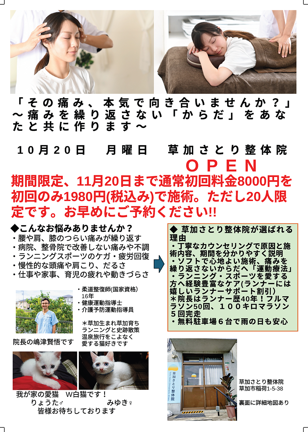 2025.10.25 当院のチラシが完成しました! 草加さとり整体院のチラシが完成しましたので紹介します。 是非ご覧ください。 10月20日(月)草加さとり整体院開店します 前の記事 【2025年12月14日】草加さとり整体院 無料セミナーのご案内 次の記事
